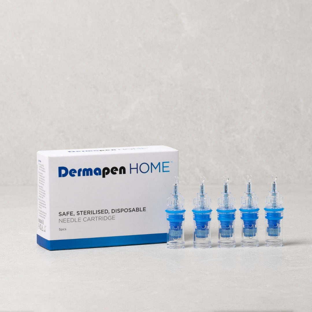 Ett paket med 5 st Dermapen Home Nålar. Nålpatronerna består av 16 st små gammasteriliserade nålar vilka skapar mikrokanaler i huden och på så vis sätter igång hudens naturliga läkningsprocess. En nål räcker till ansikte, hals och dekolletage. Nålarna är engångsnålar och är av hygieniska skäl obrukbara efter en behandling, medicinska nålar ska lämnas till apotek i särskild sticksäker behållare som finns att hämtas kostnadsfritt på apoteket.